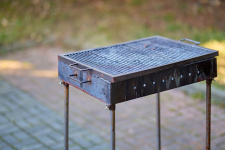 Iron grill for cooking meat on a barbecue with hives in nature. Summer atmosphere and hiking with friends. High quality photo