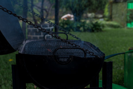 Barbecue with burning coals for cooking meat outdoors. Summer atmosphere and hiking with friends. High quality photo