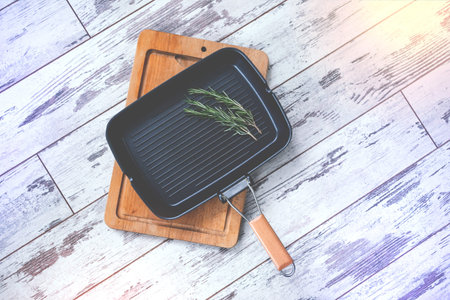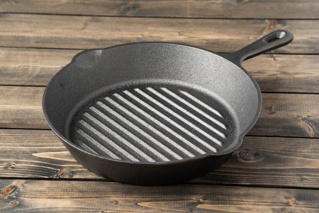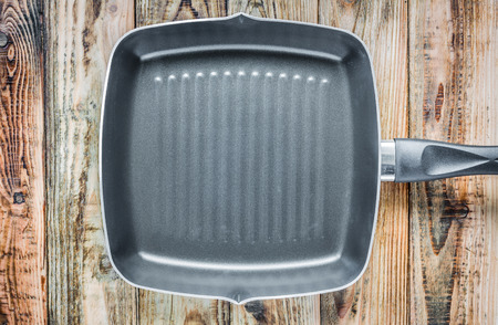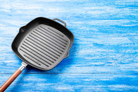 Close-up of an empty black grill pan on a wooden background, top view. Copyspace