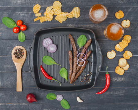 Grilled Beef sausages in a pan with a beer and a snack. Top view.