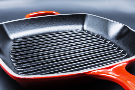 Empty black cast heavy iron grill pan on modern oak kitchen countertop, modern kitchen equipment