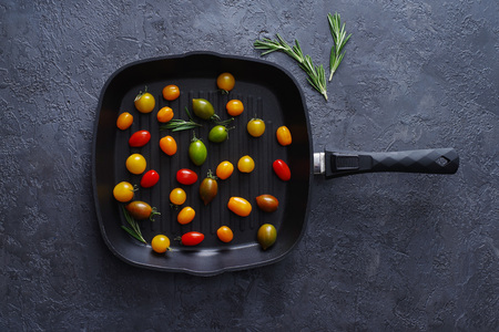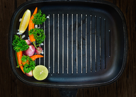 World vegan day concept. Empty grill pan with fresh vegetarian various ingredients for cooking vegan grilled food top view