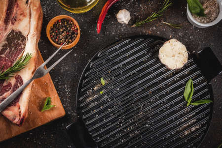 Raw beef marbled meat striplon rib eye steak with spices, grill pan, and herbs, dark background top view, copy space