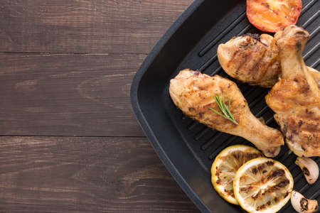 Grilled Chicken Breast Fillet on grill pan with rosemary, top view. Grilled meat steak on rustic black background.