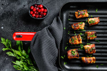 Baked bacon wrapped chicken breast in a pan. Black background. Top view.