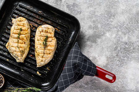 grilled chicken breast in a pan with thyme and garlic. gray background. Top view. Copy space.