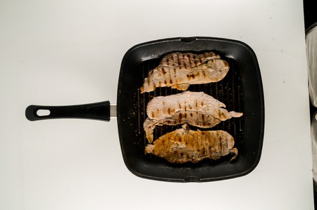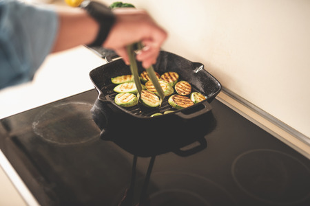 The process of cooking in the kitchen. Special black grills on the hob. Soft focus.