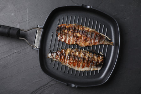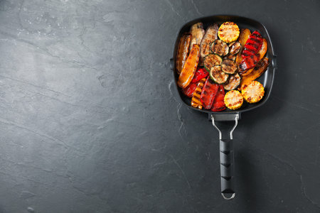 Delicious grilled vegetables in pan on dark textured table, top view. Space for text