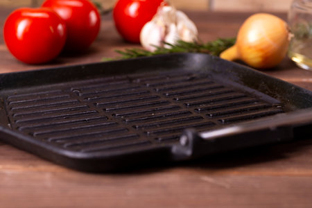 empty grill pan, next to tomatoes, onions and garlic on a wooden table