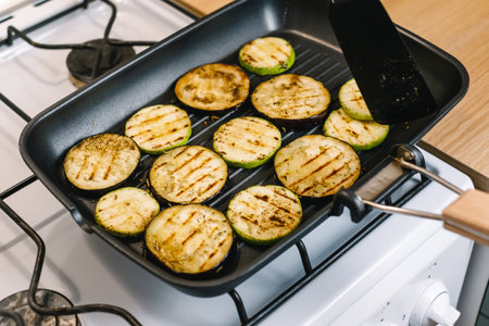 Grilling eggplant and zucchini in a black pan, close-up. High quality photo