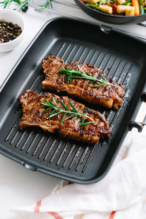 Grilled beef steak with rosemary in black grill pan on the table. High quality photo