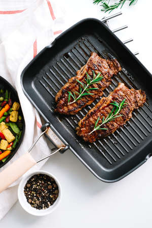 Grilled beef steak with vegetables and rosemary in black grill pan on the table. High quality photo