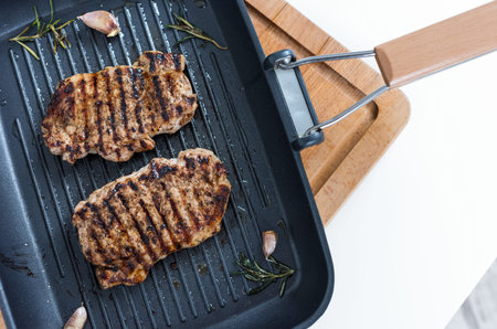 Grilling cooking New York beef sirloin strip steaks with rosemary and garlic on cast iron grill pan skillet on a ceramic stove counter top at home.