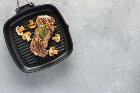 Grilled beef steak with mushrooms and spices on a grill pan on a gray background