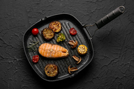 Frying pan with tasty grilled salmon steak and vegetables on black background