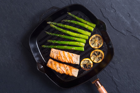 Roasted salmon fish fillet with rosemary on a grill pen. Homemade healthy dinner