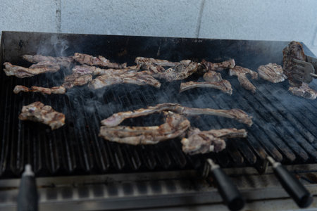 Smoked pieces of meat on a restaurant grill ready to be served