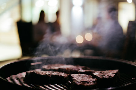 Close-up photo of delicious meat being grilled. In the background, friends and family are sitting and waiting for a meal.