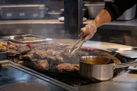 Chef preparing grilled meat on grill in restaurant closeup