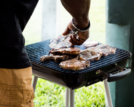 African American Nigerian man grilling roasting chicken thighs on Barbeque
