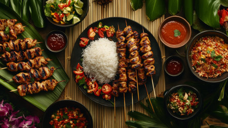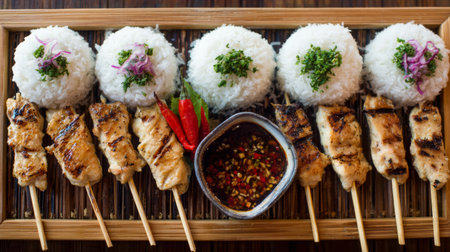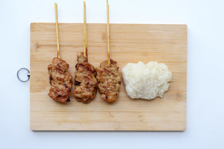 High angle view of Grilled pork skewers and sticky rice on a wooden tray. white background