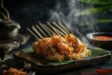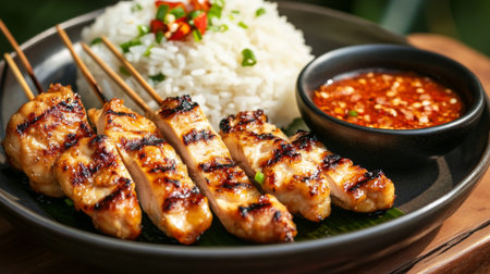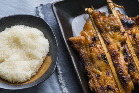 Barbecue pork or grilled pork skewer on plate and sticky rice in bowl, Thai street food