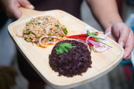 Person hand puts white rice from the steel pan to wooden paper plate during lunch in restaurant