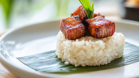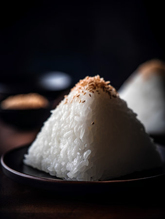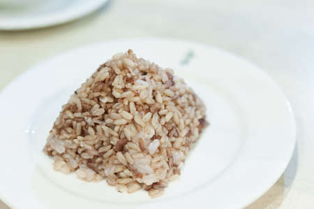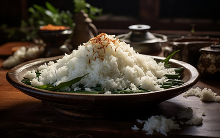 Nasi dagang special brown white rice cooked with coconut milk and spice on black off white rim plate on wooden background