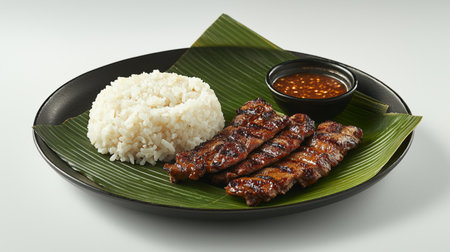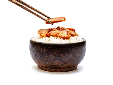 White rice with grilled pork and chopsticks in black bowl on white background, Rice from asia, Rice food of asian style