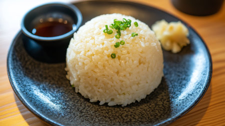 Rice in a porcelain bowl, with Japanese chopsticks, soy sauce, served on a gray stone table Close up