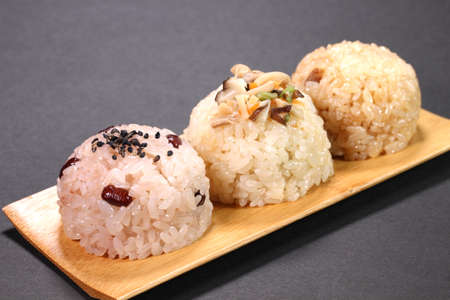 Cooked rice and sprinkled with white sesame and black sesame seeds. Top view