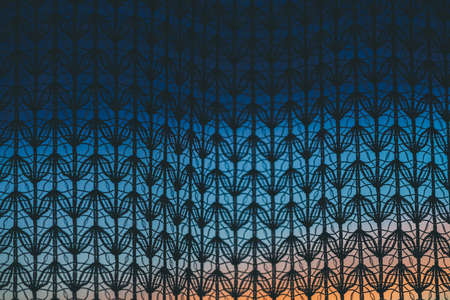 Amazing romantic sunset in window behind silhouettes of tulle texture. Wonderful warm orange blue dawn sky from window through patterned curtain. Cosiness background of scenic sunrise. Copy space.