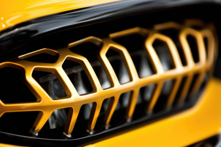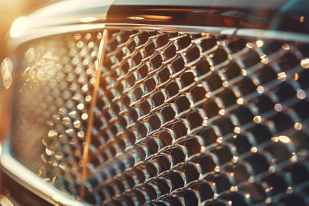 A close-up of the grille of a luxury car, its intricate design creating an abstract pattern in the soft, warm light