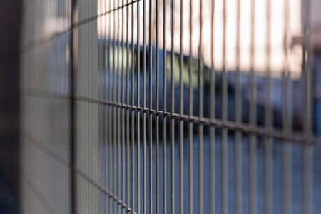 Dark metal fence grid with pattern of numerous small shaped cells installed on light blurred background extreme close view