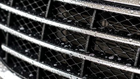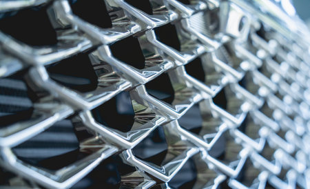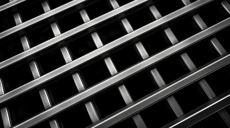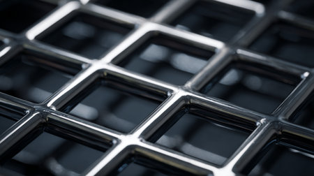 A detailed close-up of a sleek stainless steel grid showcasing a shiny reflective surface set against a dark background, perfect for design use.