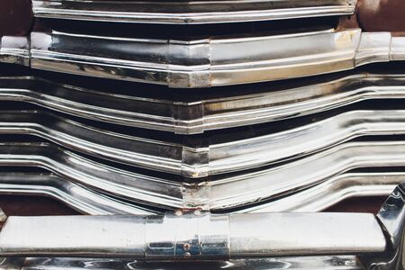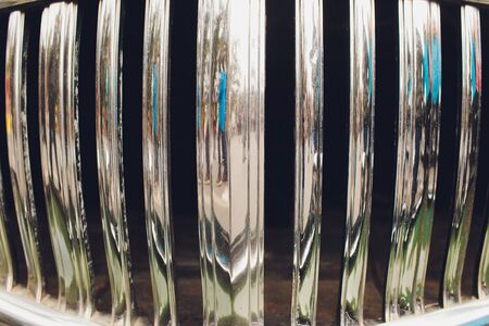 Shiny chromed front radiator grill of classic luxury car.