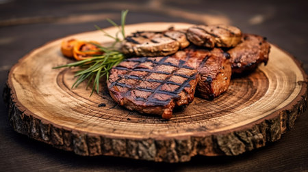 illustration of grilled steak with vegetables on wood plate. Created with Generative AI