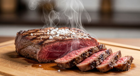 A close up of a perfectly grilled steak, partially sliced, resting on a wooden cutting board. Coarse salt crystals and visible grill marks adorn the juicy, medium rare meat, with steam rising, indicating it is hot and fresh.