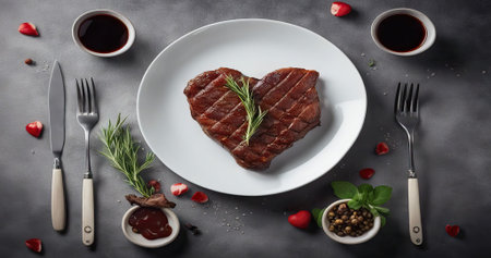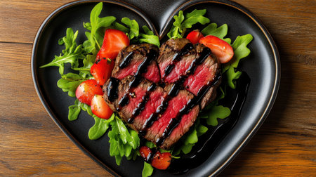 Indulge in a heart-shaped grilled steak garnished with fresh salad and tomatoes, finished with a balsamic drizzle. Perfect for romantic dinners.
