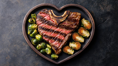 A beautifully arranged heart-shaped steak paired with perfectly grilled Brussels sprouts, ideal for romantic dinners or special occasions.