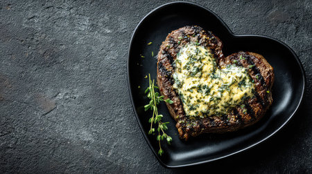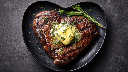 A stunning grilled steak served in a heart shape on a black plate, topped with savory herb butter, perfect for a romantic dining experience.
