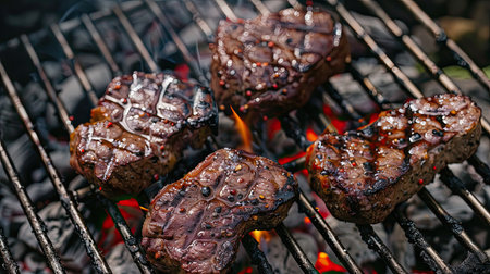 Juicy steaks sizzling on a charcoal BBQ grill outdoors, top view.