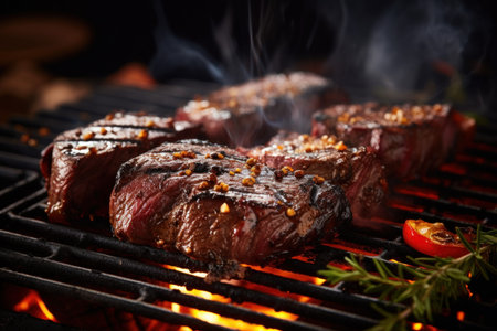Grilled steak medallions sizzling on a barbecue grill, seasoned with fresh herbs and a sprinkle of salt. steam rises as the tender cuts cook to perfection, showcasing a delicious and flavorful culinary experience. Generative AI