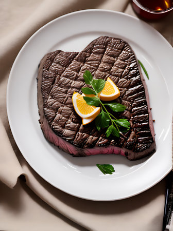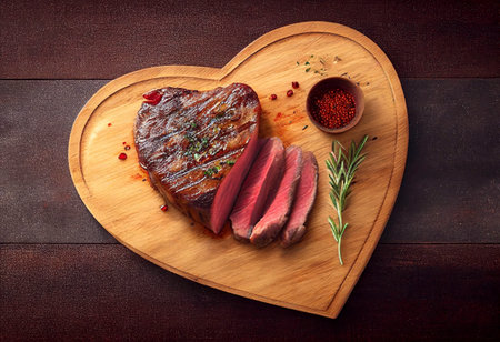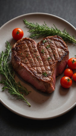 AI Generated. Juicy Steak in the Shape of a Heart With Herbs and Tomatoes