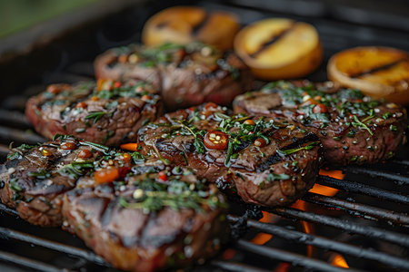 Juicy, perfectly grilled steak garnished with fresh herbs and chili slices, sizzling over an open flame with halves of charred lemons in the background. ideal for showcasing summer bbq, grilling techniques, and gourmet food presentation. Generative AI