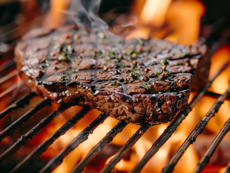 A piece of meat is being cooked on a grill, with the flames licking the edges of the meat. Concept of anticipation and excitement, as the meat cooks and the flames lick the edges
