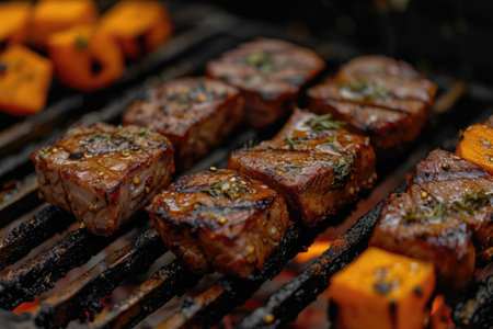 Sizzling steak infused with herbs, paired with golden-brown tomatoes, resting on a grill, evoking a flavorful outdoor cooking scene with warm, invitin