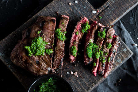 Juicy steak medium rare beef with spices and pesto sauce on wooden board on black background. Top view.