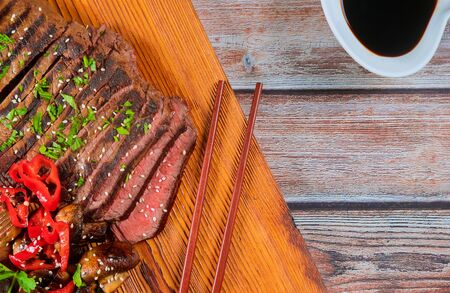 ready to eat steak beef black Angus. top view. copy space for text.