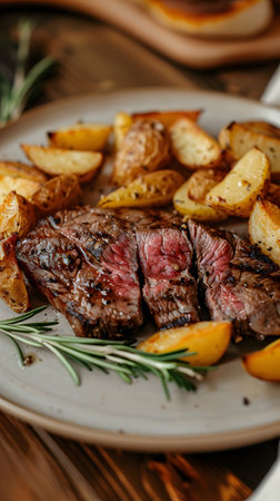 Tender beef steak seasoned with rosemary, grilled to perfection, paired with crispy roasted potatoes. A delightful dish that blends smoky flavors of the steak with the earthy aroma of rosemary.